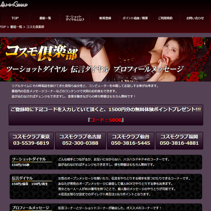 日本全国の素人女性とSMプレイと楽しめるテレクラ・ツーショットダイヤル。4つの主要都市にセンターが置かれているので地域別に女性を選べる。コスモクラブの機能はツーショット・伝言ダイヤル・プロフィール再生の3種類。AMMグループなので安心感して遊べる。